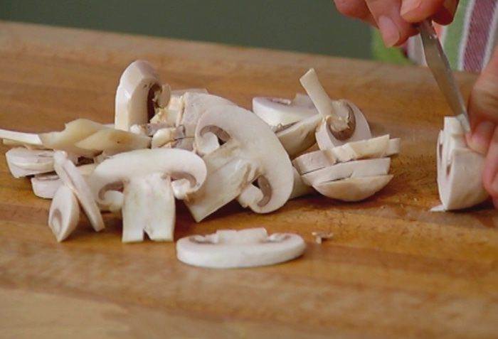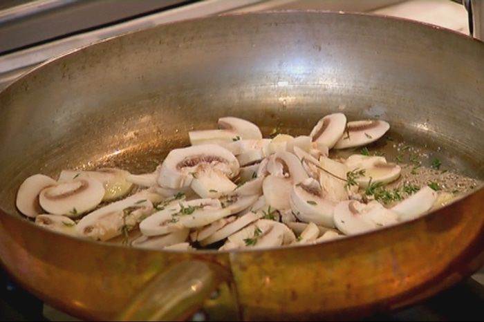 • Разогреть в сковороде оливковое масло, выложить грибы, посолить, поперчить, посыпать листьями тимьяна, перемешать и обжаривать 3-4 минуты.