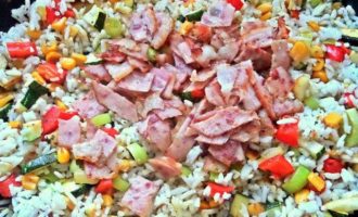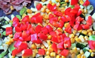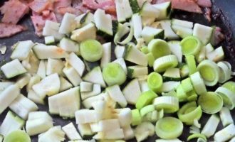 Отодвигаем или убираем ветчину и добавляем в сковороду нарезанные овощи. Жарим на масле виноградных косточек от Biolio.