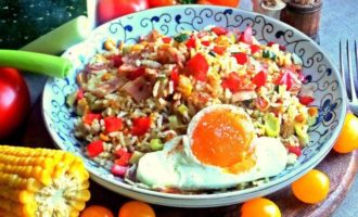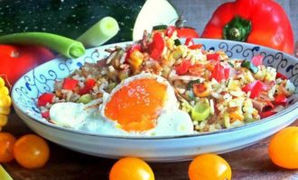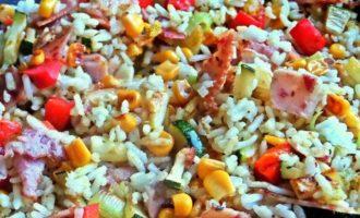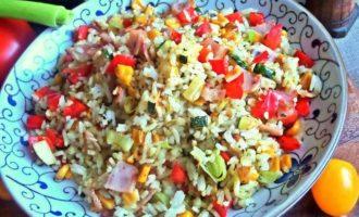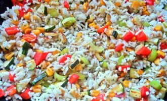 Подать просто рис с овощами на общем блюде.
