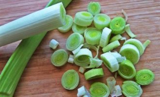 Порей нарезать колечками.