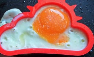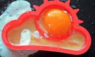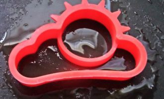 По желанию некоторых едоков-любителей яичницы, делаем глазунью с помощью такой формочки. Налить масло виноградных косточек в сковороду и поставить в него формочку.