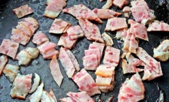 Ветчину или бекон нарезать и бросить на сковороду, обжарить слегка.
