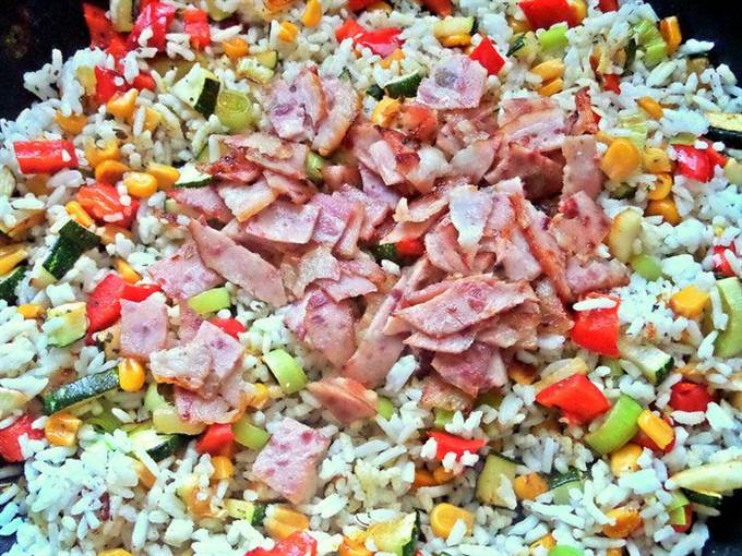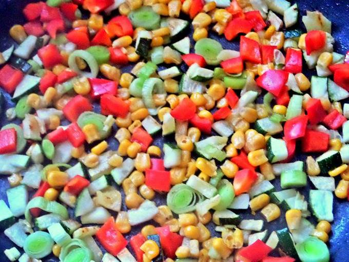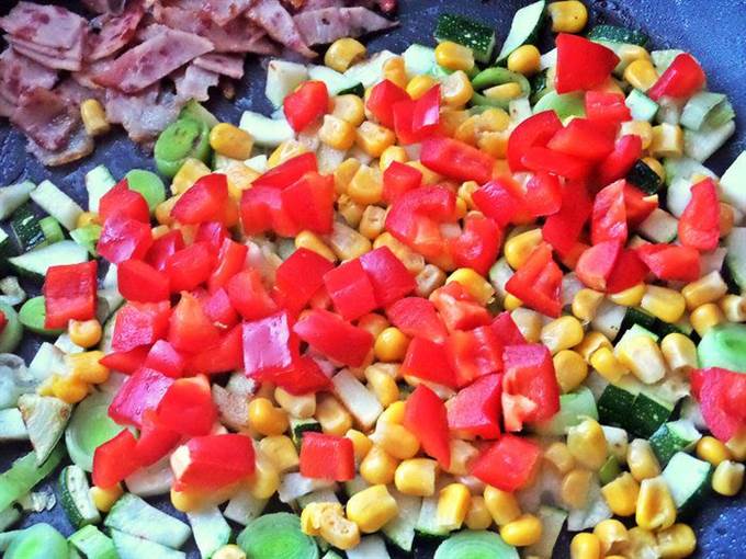 Отодвигаем или убираем ветчину и добавляем в сковороду нарезанные овощи. Жарим на масле виноградных косточек от Biolio.