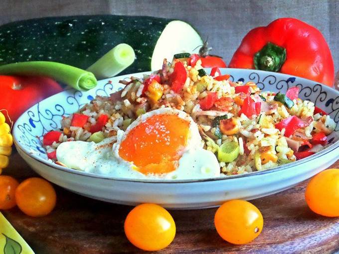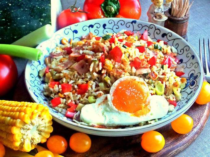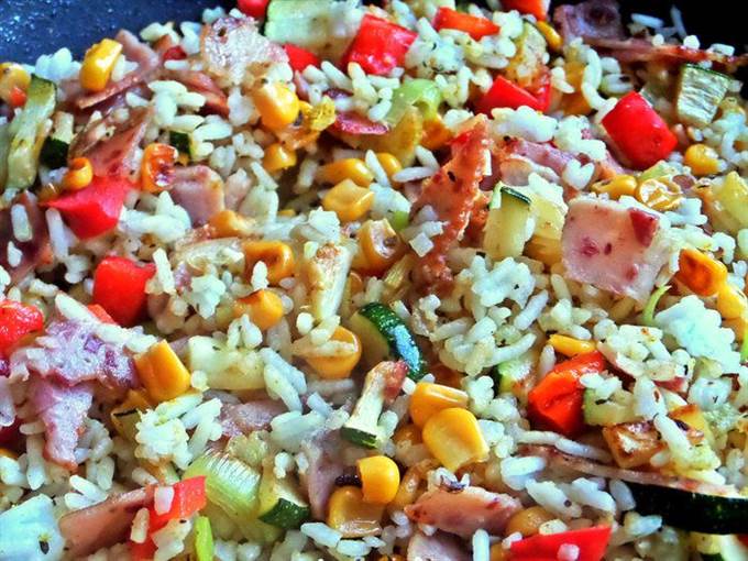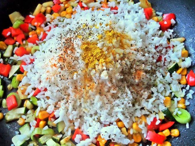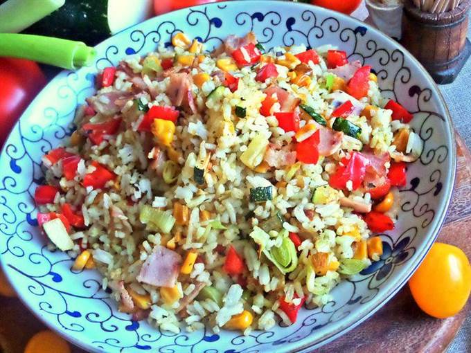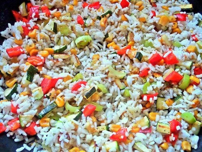 Подать просто рис с овощами на общем блюде.