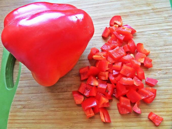 Сладкий перец нарезать тоже кубиками.