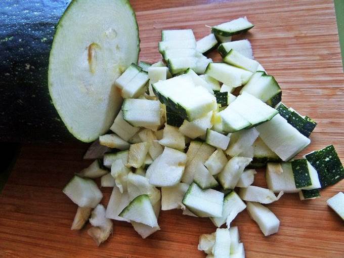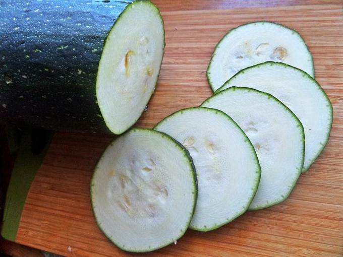 Кабачок делим на кольца.