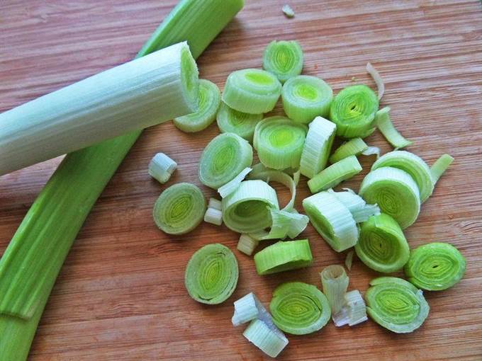 Порей нарезать колечками.