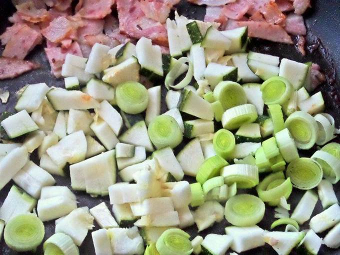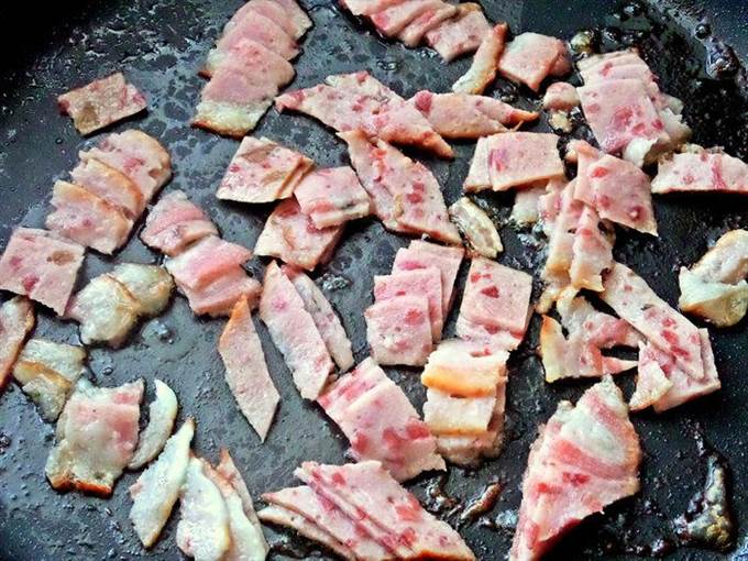 Ветчину или бекон нарезать и бросить на сковороду, обжарить слегка.