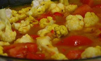 Добавить к рису помидоры и цветную капусту, перемешать и готовить еще 10 минут.