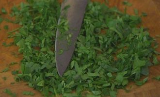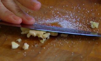 Чеснок почистить, раздавить плоской стороной ножа и растереть с солью.