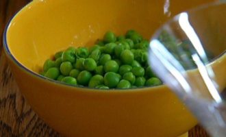 Добавить к рису зеленый горошек и кинзу, перемешать и держать на огне еще 5 минут.