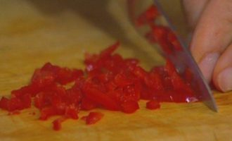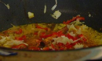 Разогреть в сковороде вок растительное масло, добавить кардамон, тмин, корицу, куркуму, перец чили, имбирь и чеснок с солью, все немного прогреть.