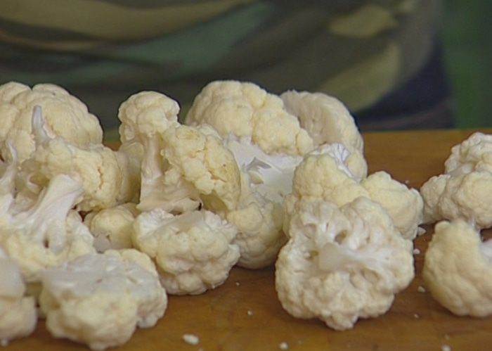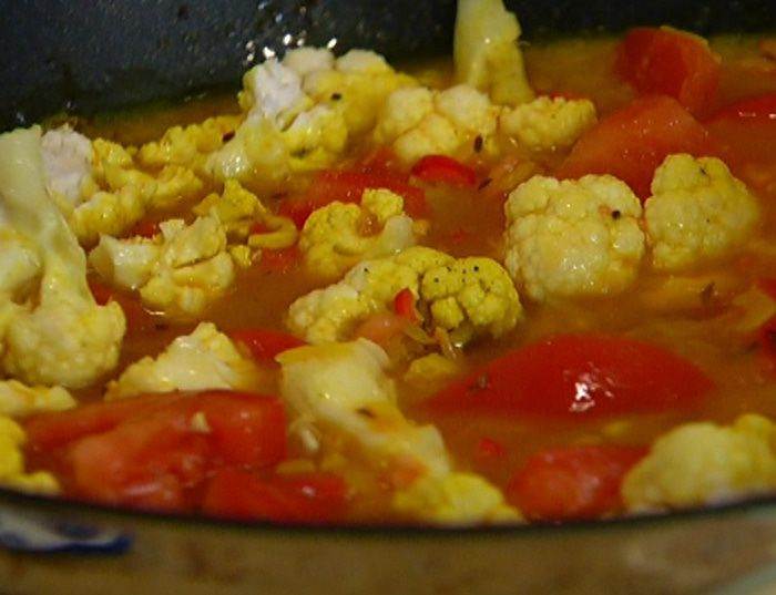 Добавить к рису помидоры и цветную капусту, перемешать и готовить еще 10 минут.
