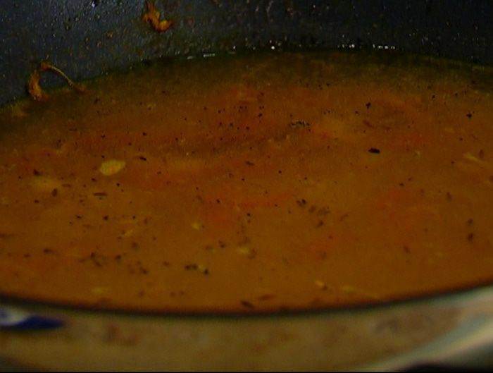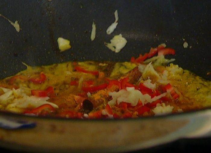 Разогреть в сковороде вок растительное масло, добавить кардамон, тмин, корицу, куркуму, перец чили, имбирь и чеснок с солью, все немного прогреть.