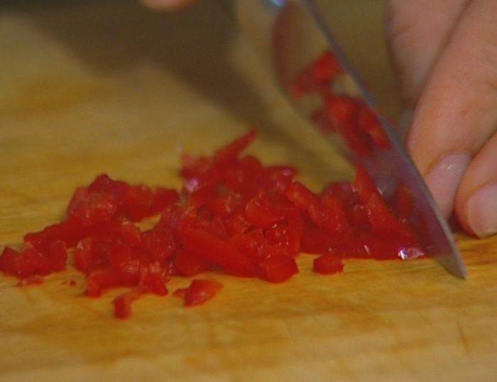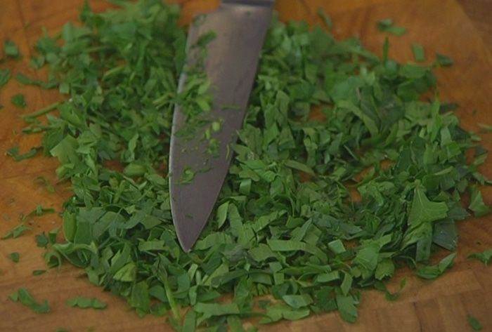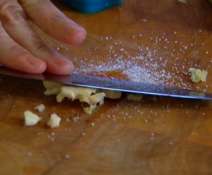 Чеснок почистить, раздавить плоской стороной ножа и растереть с солью.