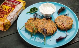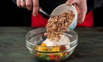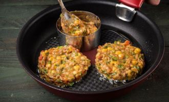 Готовый рис отправить к кукурузе с перцем, все перемешать. Всыпать муку и еще раз перемешать.