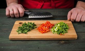 Сладкий перец вымыть, очистить от семян и нарезать маленькими кубиками. Зеленый лук и кинзу мелко порубить.