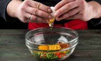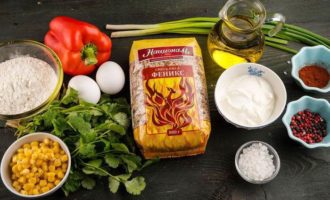 Соединить сладкий перец, кукурузу, зеленый лук и кинзу, добавить яйца, молотую паприку, посолить, поперчить.