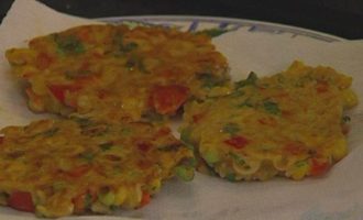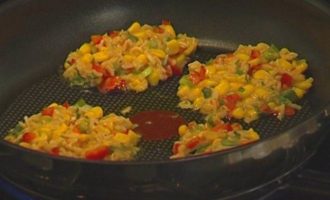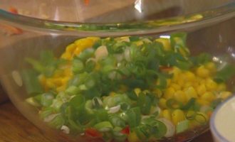 Соединить сладкий перец, кукурузу, зеленый лук и кинзу, добавить яйца, молотую паприку, посолить, поперчить.