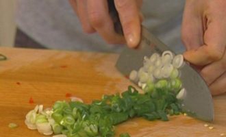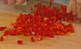 Сладкий перец вымыть, очистить от семян и нарезать маленькими кубиками.