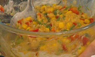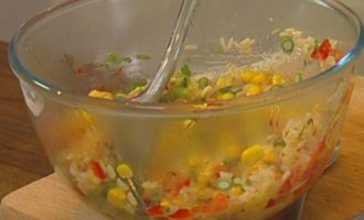 Готовый рис отправить к кукурузе с перцем, все вымешать.