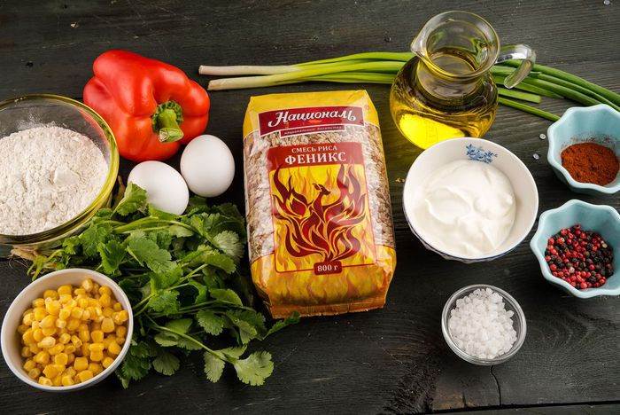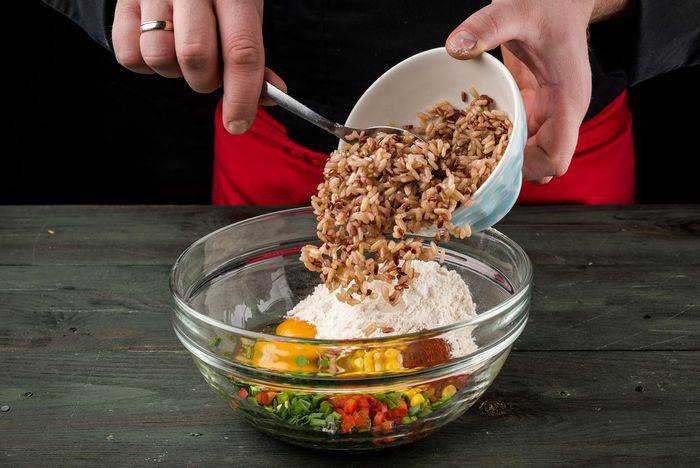 Готовый рис отправить к кукурузе с перцем, все перемешать. Всыпать муку и еще раз перемешать.
