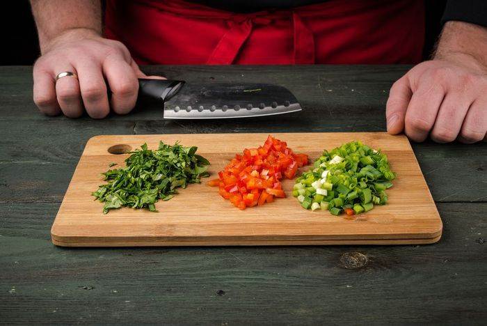 Сладкий перец вымыть, очистить от семян и нарезать маленькими кубиками. Зеленый лук и кинзу мелко порубить.