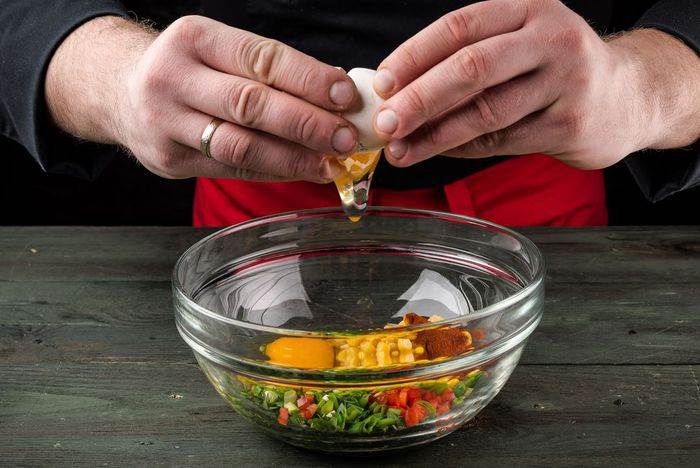 Соединить сладкий перец, кукурузу, зеленый лук и кинзу, добавить яйца, молотую паприку, посолить, поперчить.