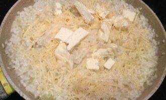 • Выключите огонь, добавьте сливочное масло и тертый сыр, перемешайте и накройте крышкой. Оставьте на пару минут и сразу подавайте.