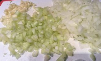 • Мелко нарежьте лук, сельдерей и чеснок.