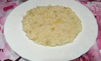 • Как только пропадет резкий алкогольный запах, и вермут частично выпарится, а частично впитается в рис, добавьте половник бульона и щепотку соли. Убавьте огонь. Продолжайте готовить, постепенно по половнику добавляя бульон, постоянно перемешивая рис. Этот процесс займет около 15 минут. Добавляя новый половник бульона, убедитесь, что предыдущий полностью впитался в рис. Рис должен стать мягким, но при этом не превратиться в кашу.