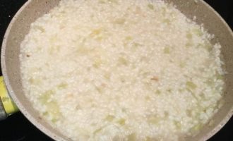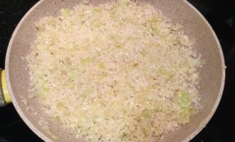 • Добавьте рис и увеличьте огонь до максимума. Готовьте 1 минуту, все время помешивая, он станет немного прозрачным. Влейте вермут и продолжайте помешивать.