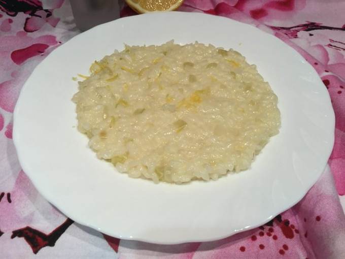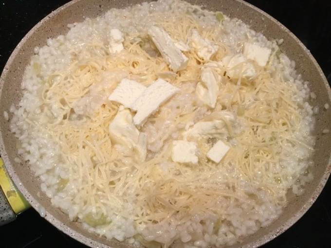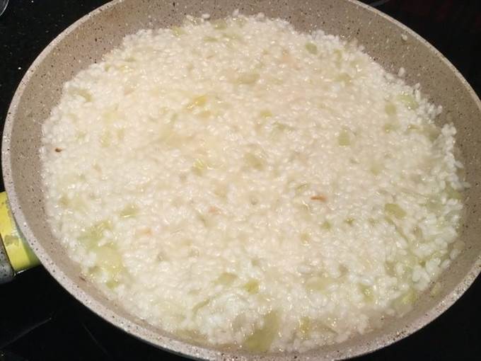 • Как только пропадет резкий алкогольный запах, и вермут частично выпарится, а частично впитается в рис, добавьте половник бульона и щепотку соли. Убавьте огонь. Продолжайте готовить, постепенно по половнику добавляя бульон, постоянно перемешивая рис. Этот процесс займет около 15 минут. Добавляя новый половник бульона, убедитесь, что предыдущий полностью впитался в рис. Рис должен стать мягким, но при этом не превратиться в кашу.