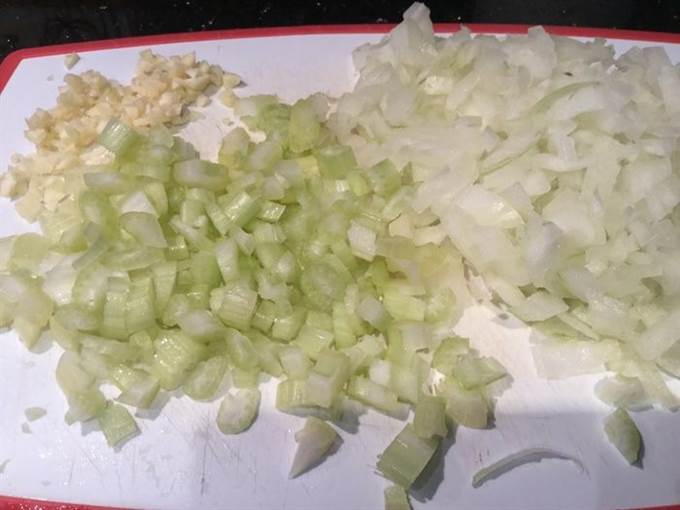 • Мелко нарежьте лук, сельдерей и чеснок.