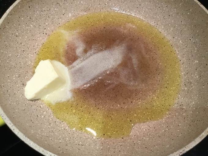 • Разогрейте сковороду, налейте оливковое масло, добавьте сливочное масло и дайте ему растаять.