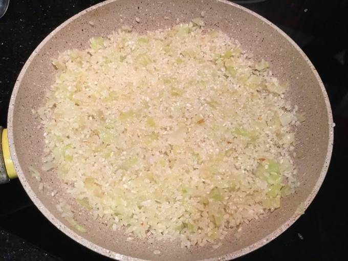 • Добавьте рис и увеличьте огонь до максимума. Готовьте 1 минуту, все время помешивая, он станет немного прозрачным. Влейте вермут и продолжайте помешивать.