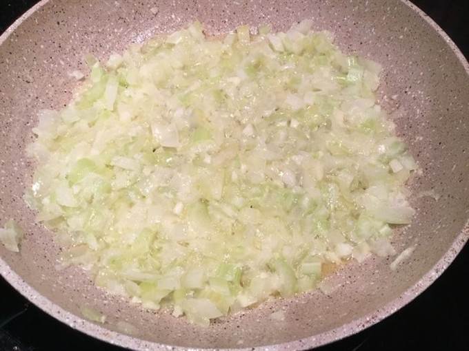 • Добавьте лук, чеснок и сельдерей, готовьте на очень медленном огне около 15 минут до тех пор, пока овощи не станут мягкими и прозрачными. Такая смесь называется soffrito.