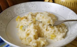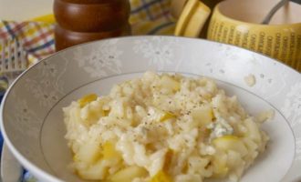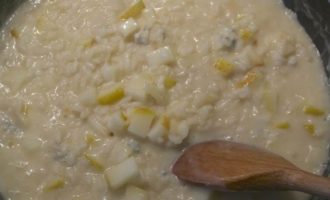 За 5 минут до окончания приготовления риса добавить нарезанные груши и сыр.