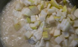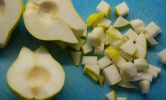Тем временем груши вымыть, удалить сердцевину и, не снимая кожуры, нарезать небольшими кубиками.