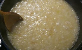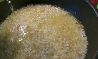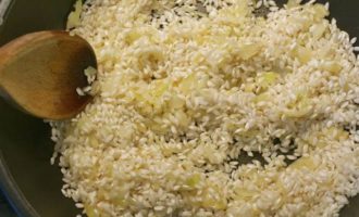 Следите, чтобы лук не зажарился! Как только лук посветлеет, всыпать рис. Перемешать и дать обжариться вместе с луком 1-2 минуты, помешивая.