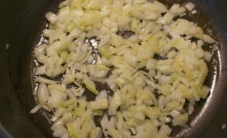 Лук мелко нарезать. Разогреть оливковое масло в сковороде с тяжелым дном и добавить тушиться лук.