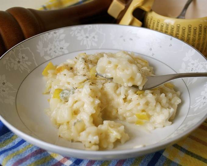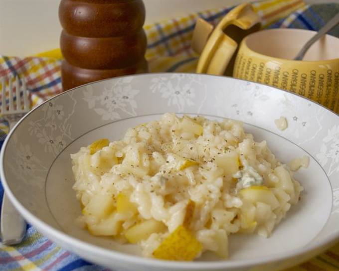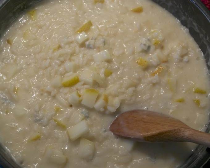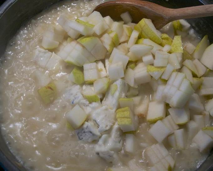 За 5 минут до окончания приготовления риса добавить нарезанные груши и сыр.