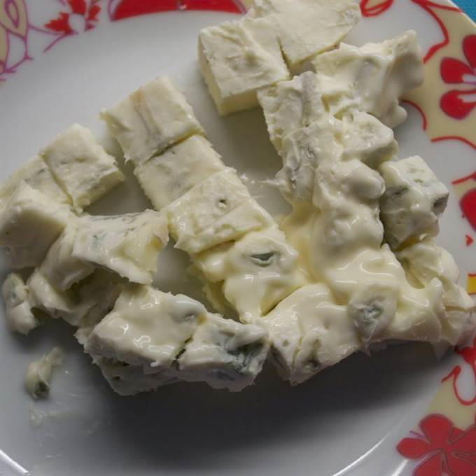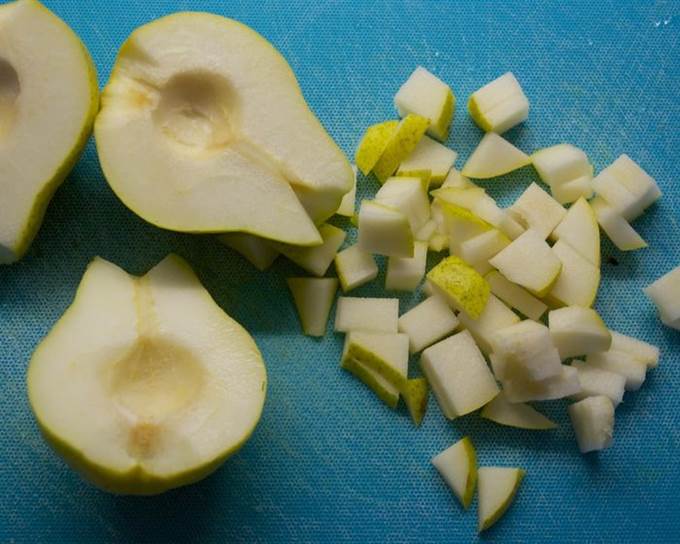 Тем временем груши вымыть, удалить сердцевину и, не снимая кожуры, нарезать небольшими кубиками.