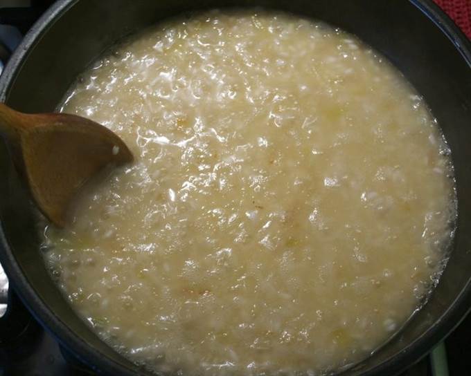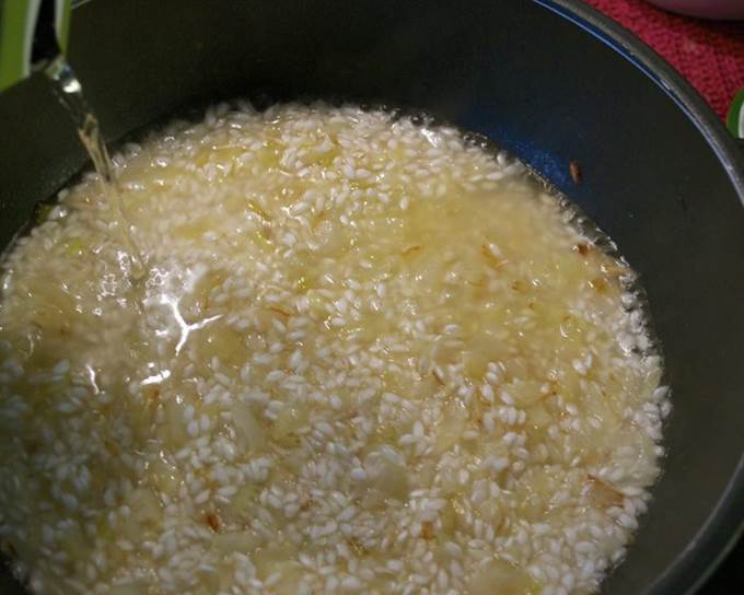 Заранее подготовить горячий бульон. Готовить ризотто, добавляя понемногу бульон… Посолить и поперчить по вкусу. На приготовление уйдет около 15-17 минут.