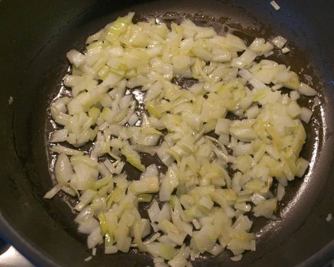 Лук мелко нарезать. Разогреть оливковое масло в сковороде с тяжелым дном и добавить тушиться лук.