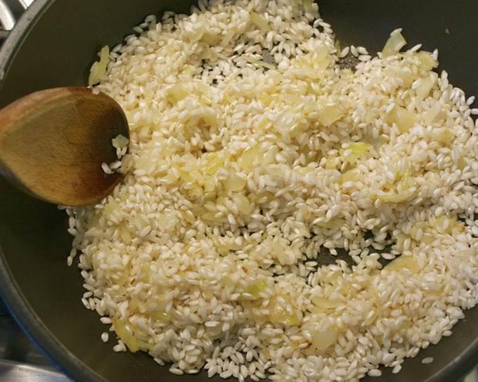 Следите, чтобы лук не зажарился! Как только лук посветлеет, всыпать рис. Перемешать и дать обжариться вместе с луком 1-2 минуты, помешивая.