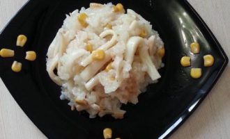 Мультиварка, в процессе работы на програме «Рис», начинает обратный отсчет, когда до завершения остается 10 минут. В этот момент, открываем ее, добавляем кальмары, кукурузу, измельченный чеснок, соль и 50 мл. воды, перемешиваем. После отключения даем настояться минут 10.