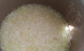 Добавляем промытый рис и обжариваем 4 -5 минут, заливаем водой. (До начала готовки я высчитала, сколько воды необходимо налить для програмы «Рис». Включаем програму «Рис».