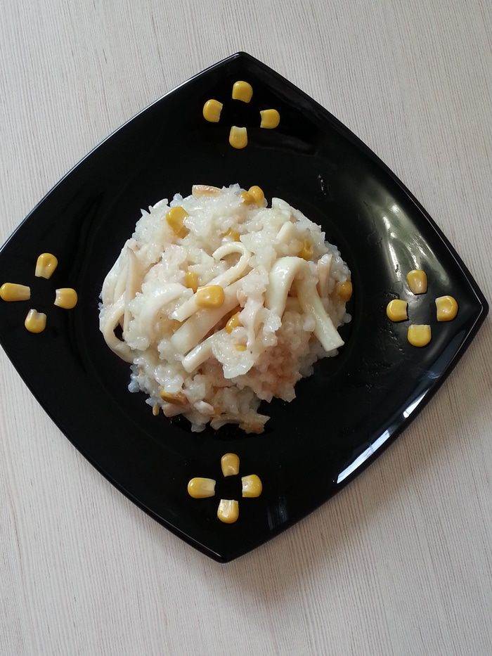 Мультиварка, в процессе работы на програме «Рис», начинает обратный отсчет, когда до завершения остается 10 минут. В этот момент, открываем ее, добавляем кальмары, кукурузу, измельченный чеснок, соль и 50 мл. воды, перемешиваем. После отключения даем настояться минут 10.