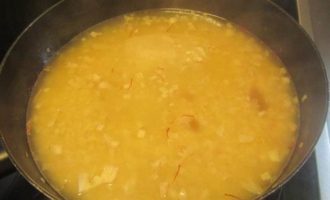 • Добавляем вино, шафран и бульон. Доводим до кипения, затем уменьшаем огонь, накрываем крышкой и готовим минут 15-20 до мягкости риса. Снимаем с огня.